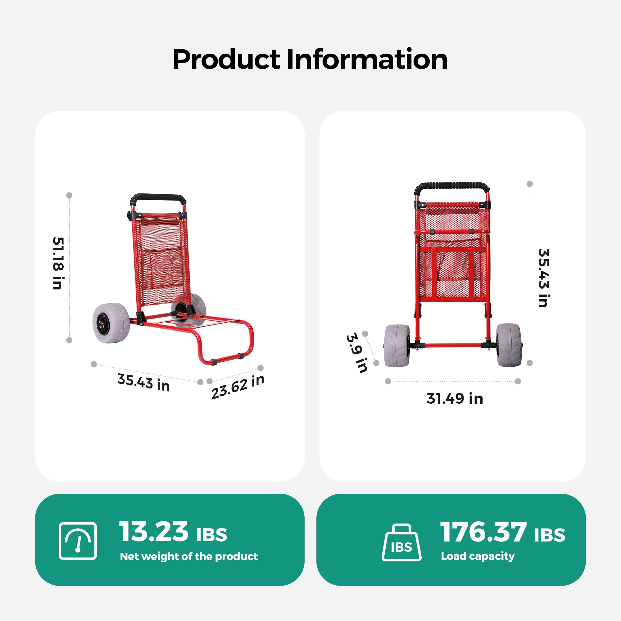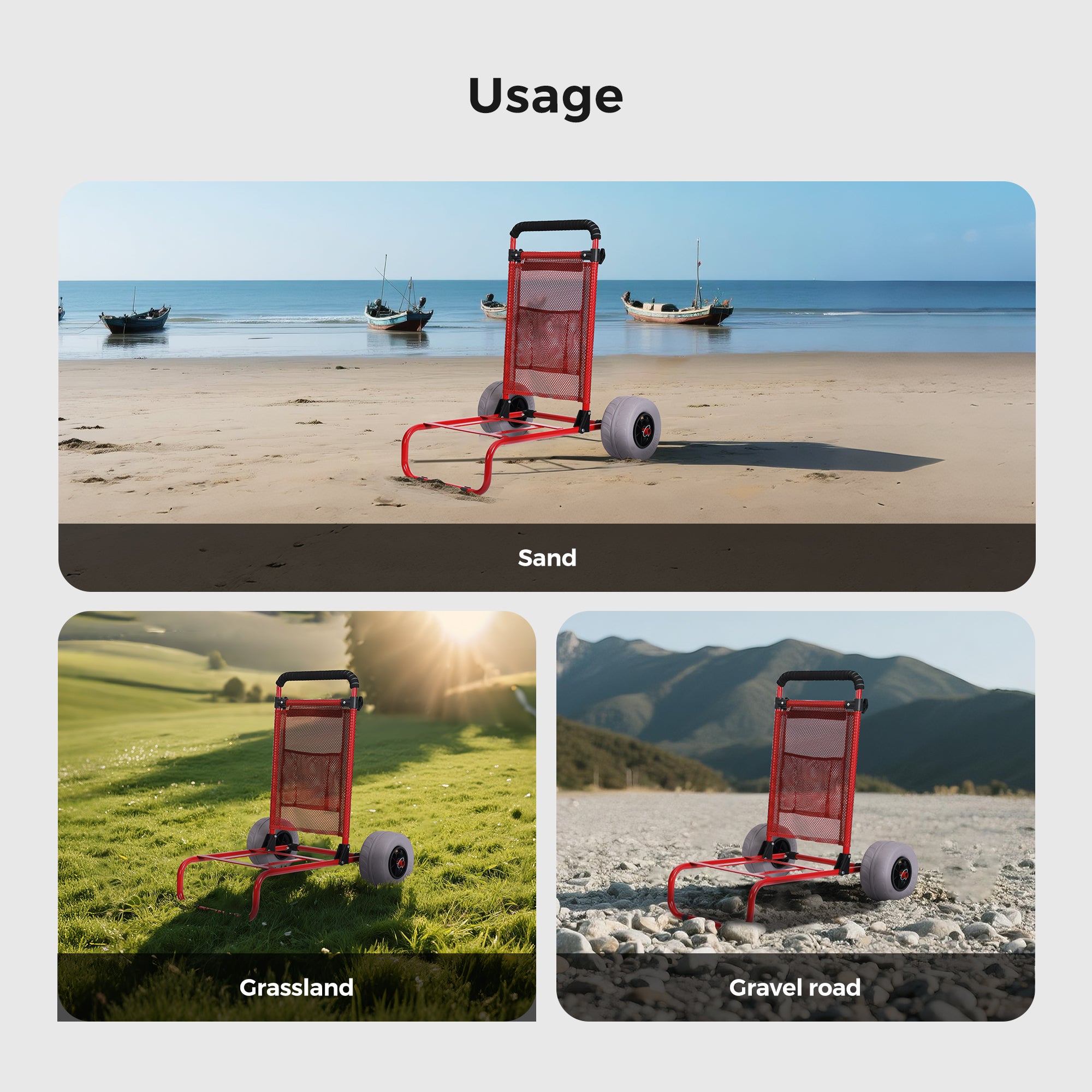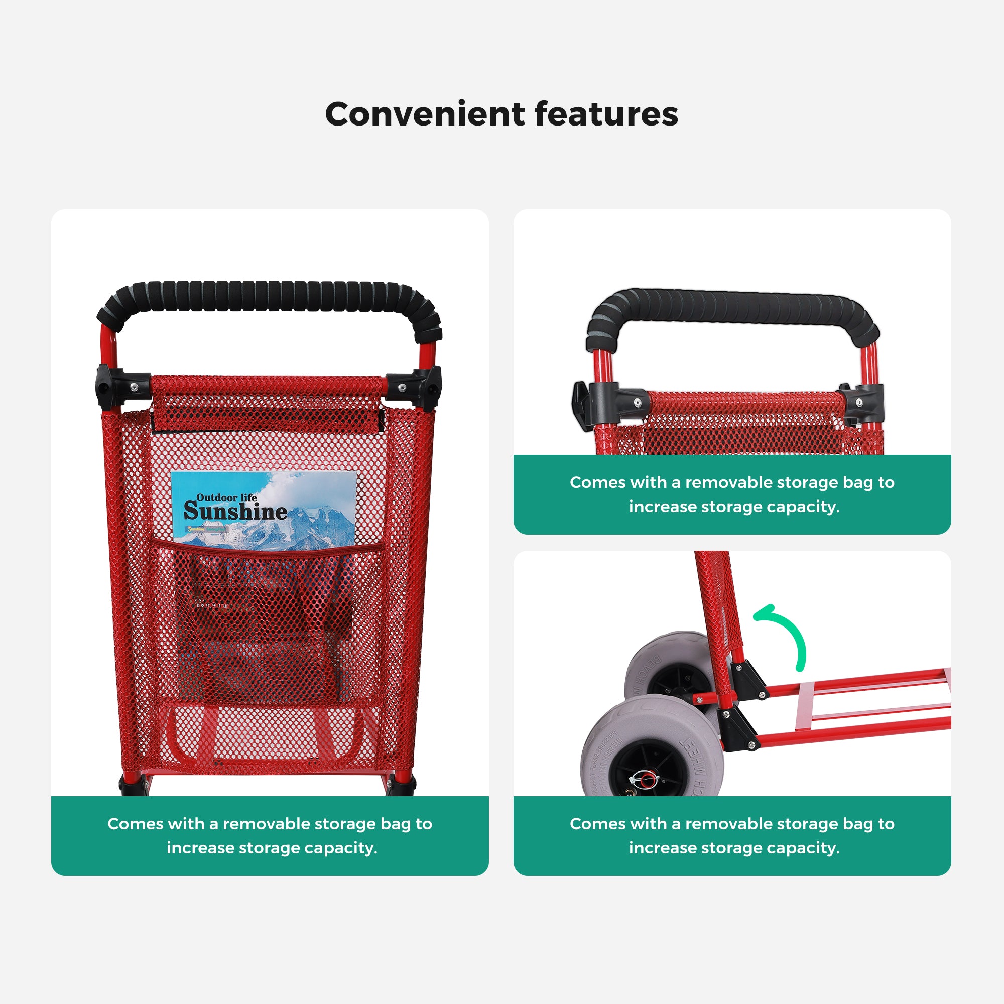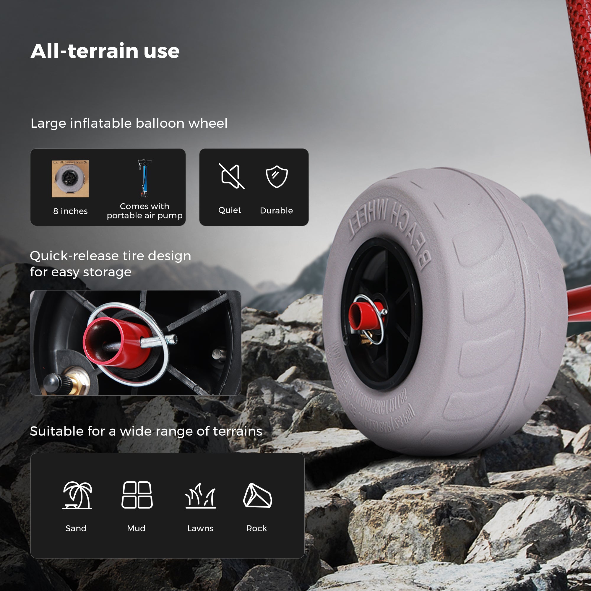 - 【9 Inch Large Balloon Wheels】 – The super-large wheel surface of the beach cart reduces resistance on sandy ground. With a single hand push, you can move away in an instant, saying goodbye to the embarrassment of being "stuck" on the beach. No need for an air pump. Ready to use right out of the box. Easy to carry for beach picnics and camping equipment.